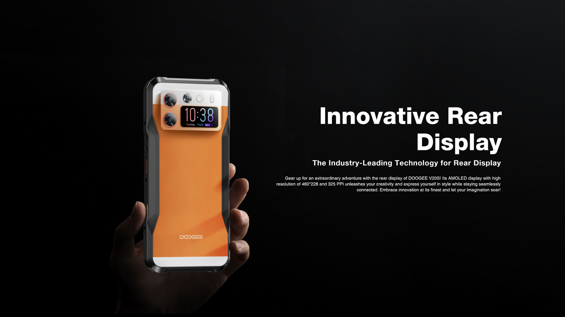 The DOOGEE V20S features a stunning 6.43-inch 20:9 AMOLED FHD+ Dot Display on the front, boasting a resolution of 10802400 pixels and 409PPI. The screen’s brightness peaks at 500cd/m2, with 16.7 million colors ensuring vibrant and clear visuals. The rear display, a 1.58-inch AMOLED screen with 460228 pixels resolution, is an innovative addition, offering convenience for quick notifications and time checks.