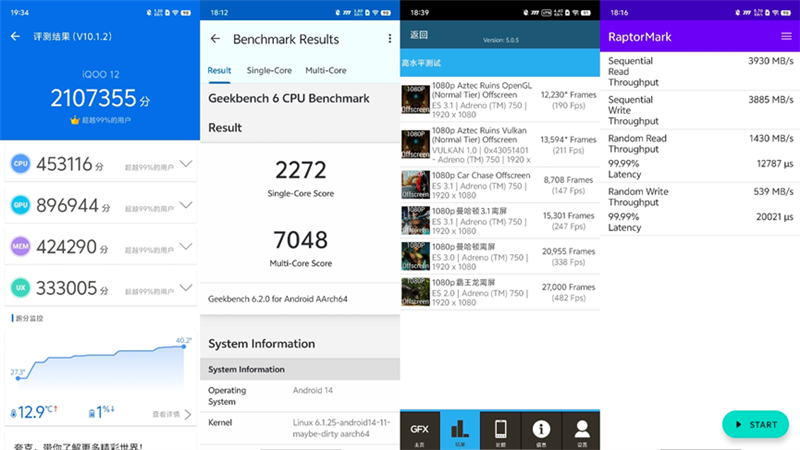 Finally, we also tested the flash memory performance of iQOO 12. The sequential read speed was 3.93GB/s, the write speed was 3.89GB/s, the random read speed reached 1.43GB/s, and the random write speed reached 0.53GB/s. , consistent with the level of UFS4.0.