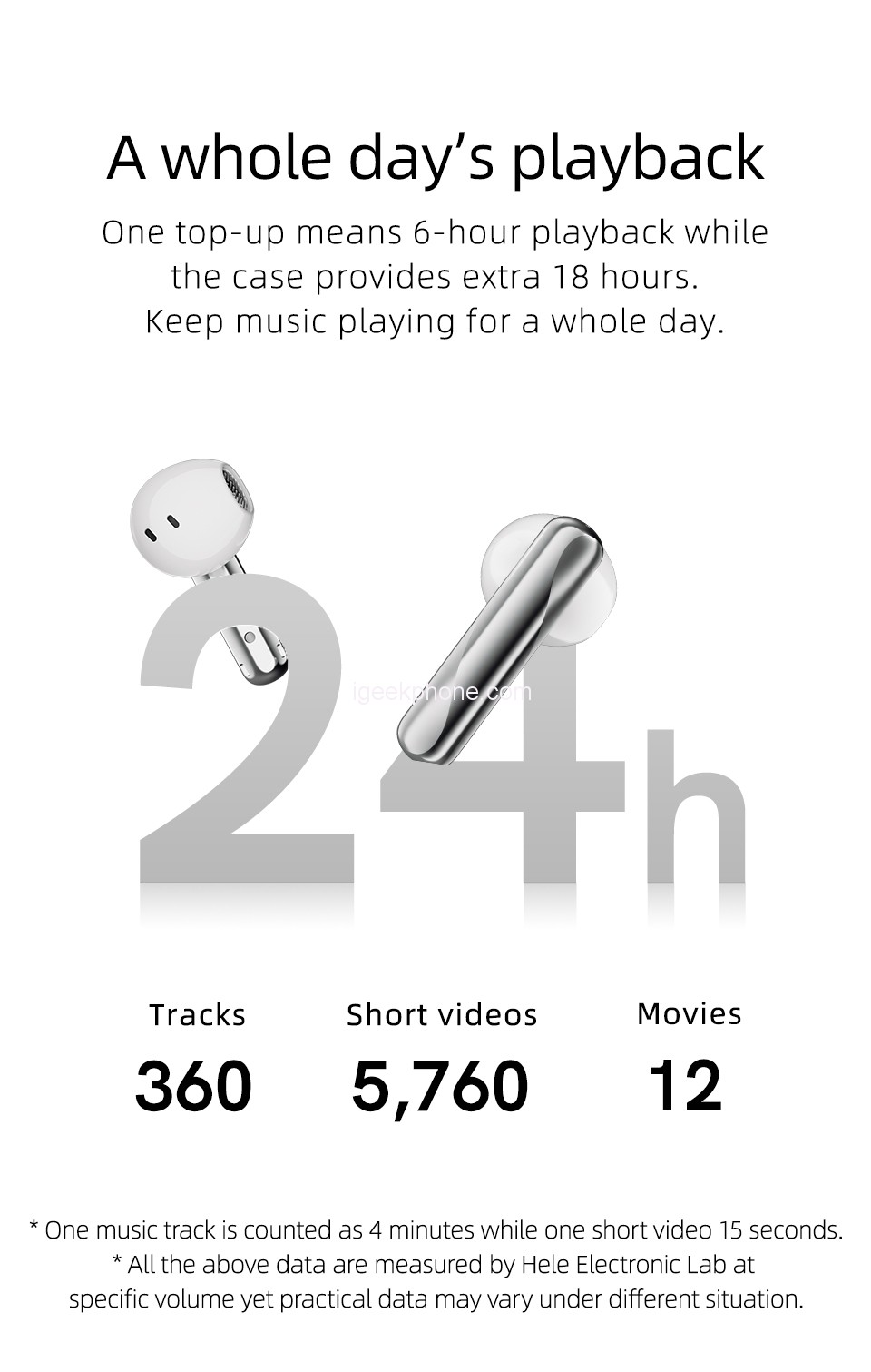 The QCY T21 FairyBuds offers a decent battery life of 3 hours for calling and 6 hours for playback on a single charge. The 290mAh battery in the case can charge the earbuds three times, providing users with a total battery life of 24 hours. The earbuds come with a Type-C charging port, making them easy to charge.