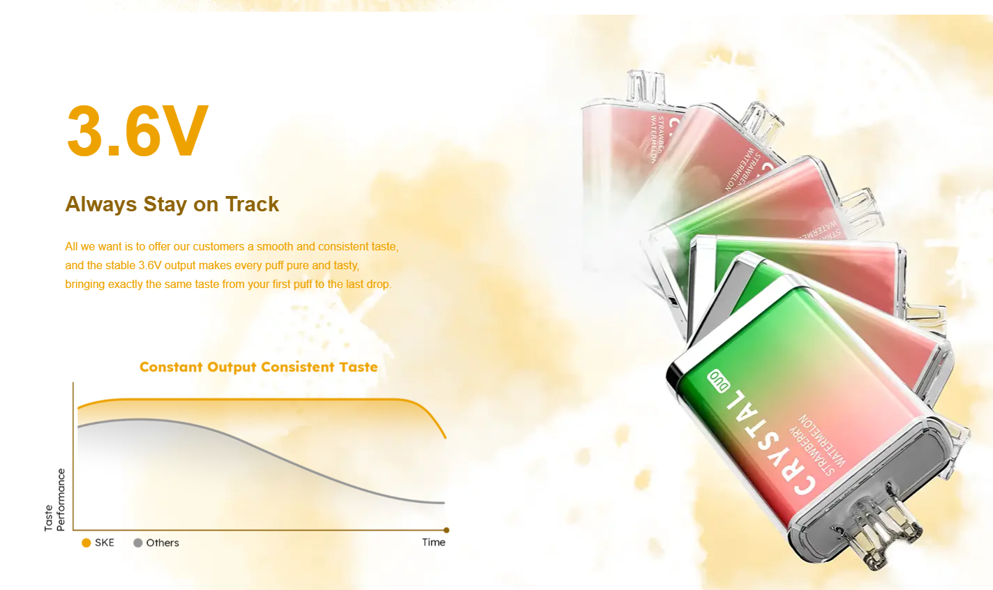 In contrast, the SKE Crystal Duo focuses on endurance and power. Boasting an impressive 6000 puffs and a 15ml e-liquid capacity, it’s tailored for those who crave a prolonged vaping experience. The 13W output and stable 3.6V ensure a consistent taste from the first draw to the last drop. With Type-C charging, the Crystal Duo can be fully charged in just 30 minutes, emphasizing quick and convenient enjoyment.
