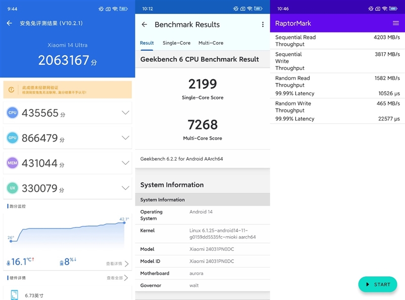 Moving on to the flash memory capabilities test, the Xiaomi Mi 14 Ultra impresses with a sequential read speed of 4203MB/s and a sequential write speed of 3817MB/s, placing it firmly at the UFS4.0 level.