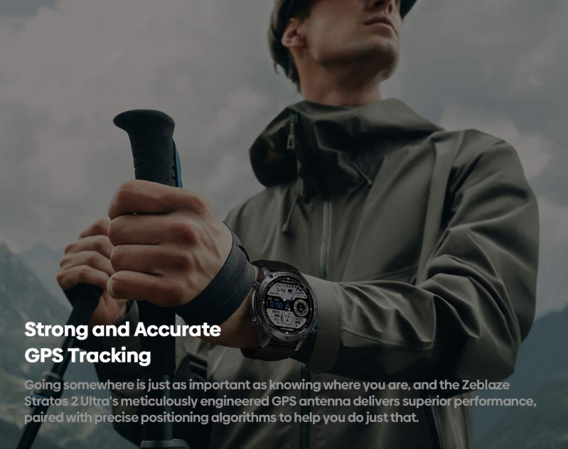 The Zeblaze Stratos 2 Ultra packs a range of impressive features. One of its standout aspects is the dual-band GNSS technology that works with 6 satellite positioning systems (GPS, GLONASS, GALILEO, NAVIC, QZSS, BDS), ensuring fast and accurate tracking wherever you are. This is further complemented by built-in tools like a compass and barometric altimeter, making it perfect for outdoor adventures.