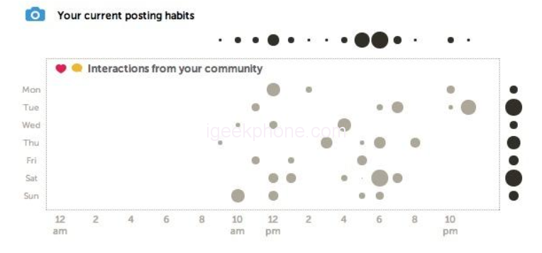 Black circles indicate when a business usually posts. Light gray circles show when a business’s community interacts. The largest light gray circle represents the best time to post for the business.