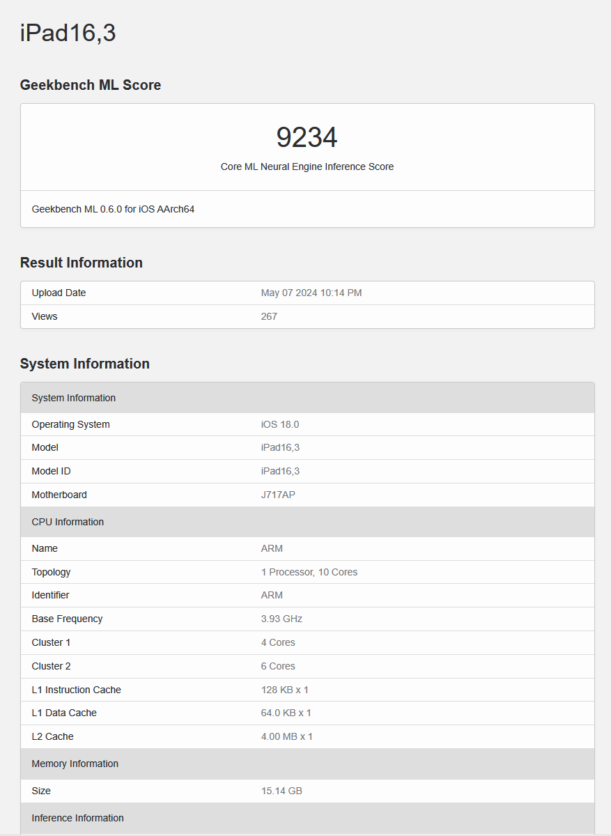 As shown in the figure, the code name of this model is J717AP, the device ID is iPad16,3, the system version recognized by Geekbench is iOS/iPadOS 18.0, the M4 chip frequency is up to 3934MHz, and the ML score is 9,234 points.