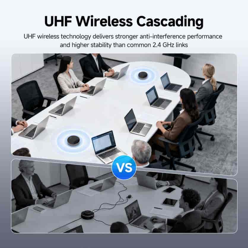 - Medium meetings (15-20people): Use the wired cascading function for easy expansion, with the UHF stable connection ensuring smooth transmission.