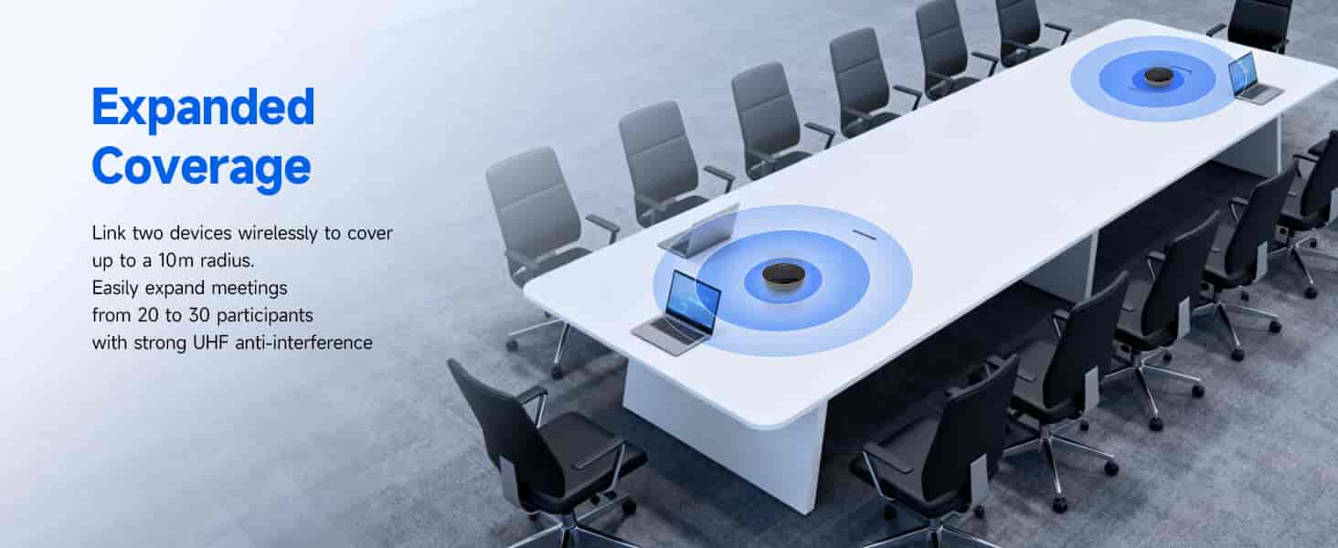 - Large meetings (20-30 people): With wireless daisy-chain cascading, two units offer up to 10 meters of coverage, ensuring clear audio from anywhere in the room.