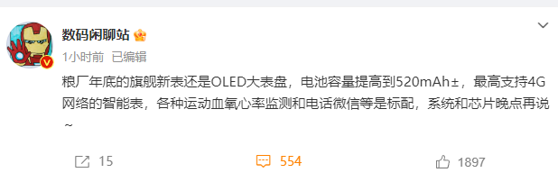 According to reports, the new Xiaomi watch is equipped with a large screen dial of OLED material, the battery capacity is increased to about 520mAh, support 4G network, can use wechat phone, support a variety of sports data monitoring, as well as blood oxygen, heart rate and other health data monitoring.