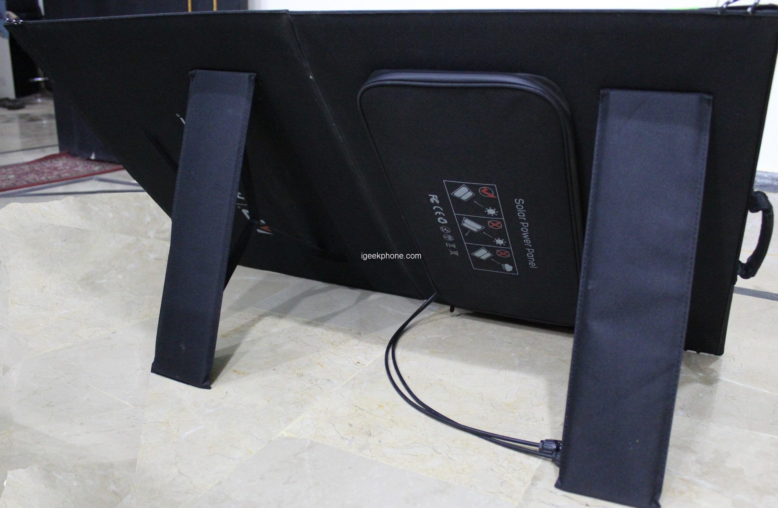 All the cables are stored in a zipped pouch, together with two legs that have to be velcroed onto the solar panel. These two legs can be partially unvelcroed and pulled out to tilt the solar panel towards the sun, after opening up the velcro closure.