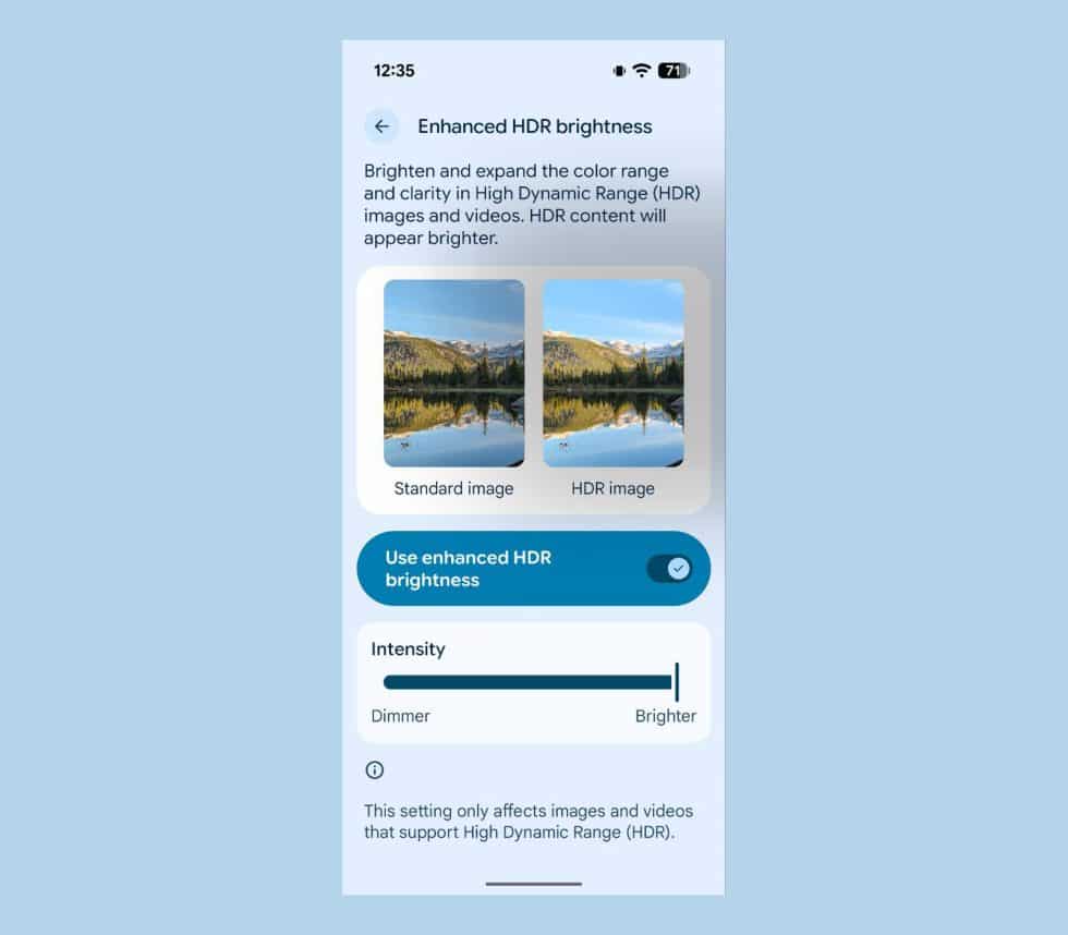 QPR2 has added a “HDR Brightness Enhancement” option in its display Settings, which can improve the brightness, color range and clarity of high dynamic range (HDR) images and videos. On the Pixel 9 Pro, after enabling this function, HDR content will appear brighter, and users can also adjust the intensity of the brightness enhancement through the slider.