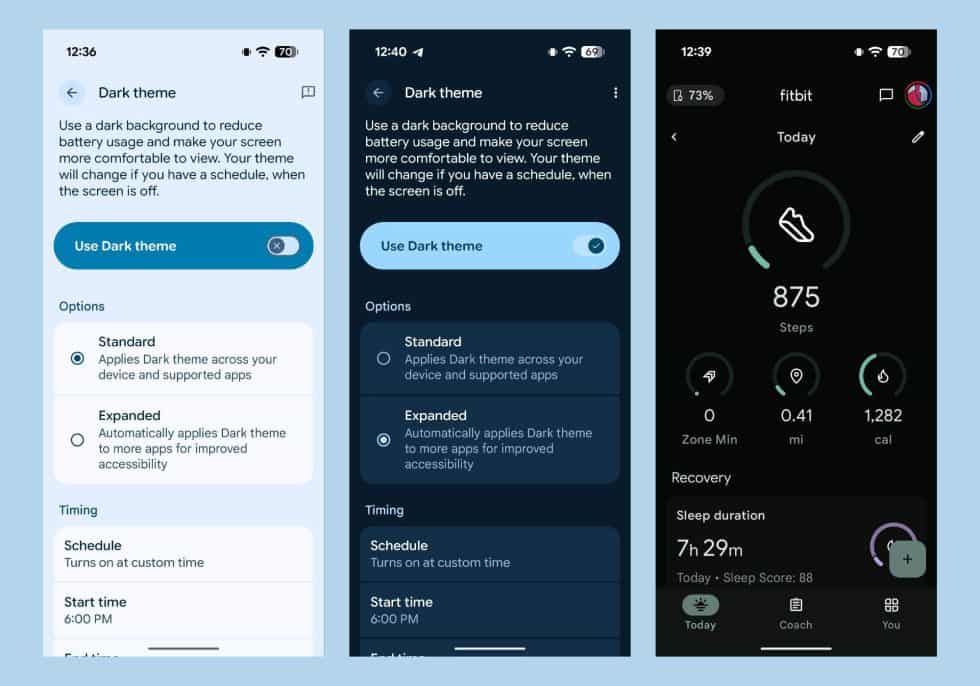 QPR2 has added an “Extend” option in the dark theme Settings, which can automatically enable the dark theme for more applications to enhance the accessibility experience. Although many apps already support dark mode, apps like Fitbit have not previously provided support for dark themes. Now, users can apply dark themes by themselves through QPR2.