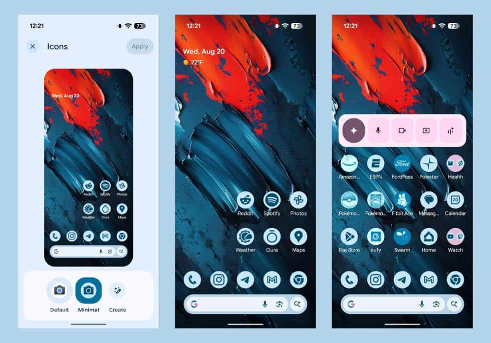 Google has introduced a “Minimize” theme option for app ICONS. For apps that support themes, the full theme effect will be applied. For applications that are not supported, some colors will be added to match the theme. For example, applications like Pokemon Go and FordPass will display a blue tone, but they won’t fully apply the theme.