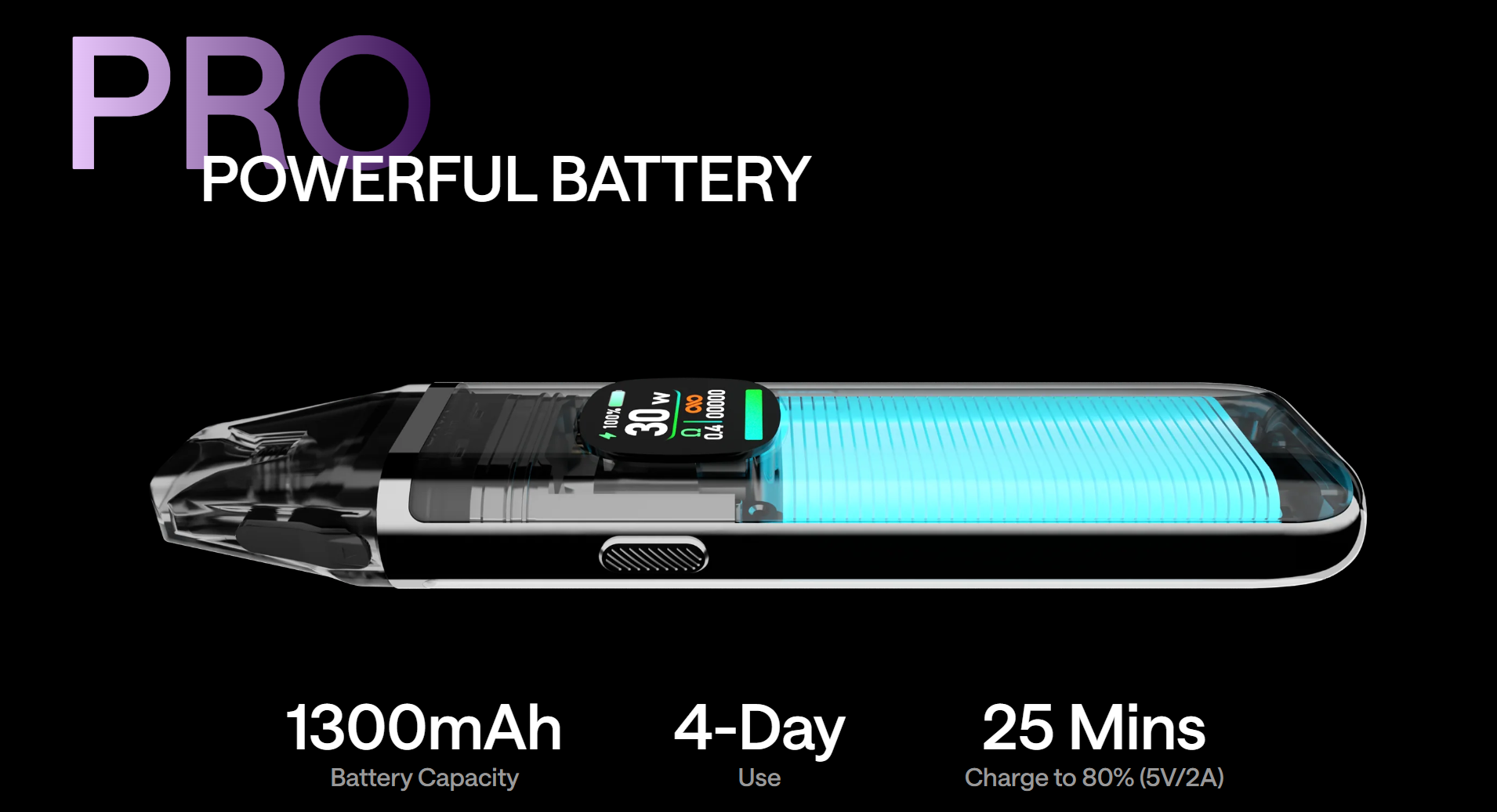 The XLIM PRO 2 has a 1300mAh battery, a significant 30% upgrade from its predecessor, the XLIM PRO, which featured a 1000mAh capacity. This battery boost extends the device’s usage time to an impressive 4 days, compared to 3 days for the previous model. The 2A fast-charging capability allows you to reach 80% charge in just 25 minutes, ensuring less downtime and more vaping enjoyment.