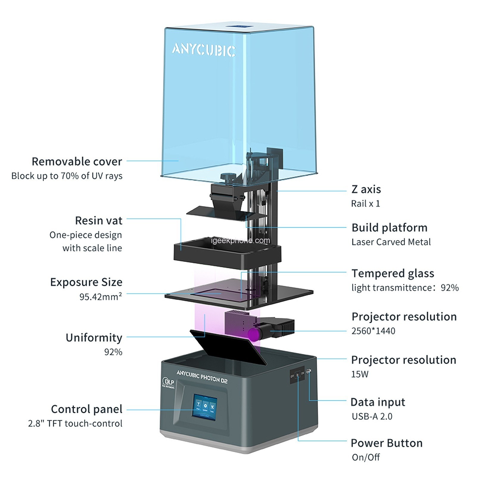 The Anycubic Photon D2 offers an impressive increase in printing volume and area compared to its predecessor, the Anycubic Photon Ultra. With dimensions of 130.56mm73.44mm165mm, the printing volume expands by 62%, while the printing area grows by 55% to reach 95.42cm². The printer features a specially designed Laser Carved Metal that enhances platform adhesion, leading to a higher success rate in printing. Additionally, the DLP® technology ensures efficient light source utilization, resulting in a low power consumption of just 15W, which is only 1/4 of that of an LCD printer. The Anycubic Photon D2 weighs 8.8 lb./4 kg and measures 17.2 x 9.3 x 8.9 in. / 438 x 236 x 226 mm (HWD).