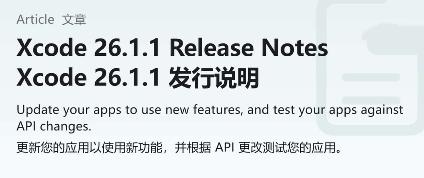 Igeekphone News, November 12th: Tech media 9to5Mac published a blog post yesterday (November 11th), reporting that Apple released the Xcode 26.1.1 version update, mainly focusing on fixing a series of vulnerabilities. And it has significantly optimized the performance of its full “Coding Intelligence” AI coding assistance function.