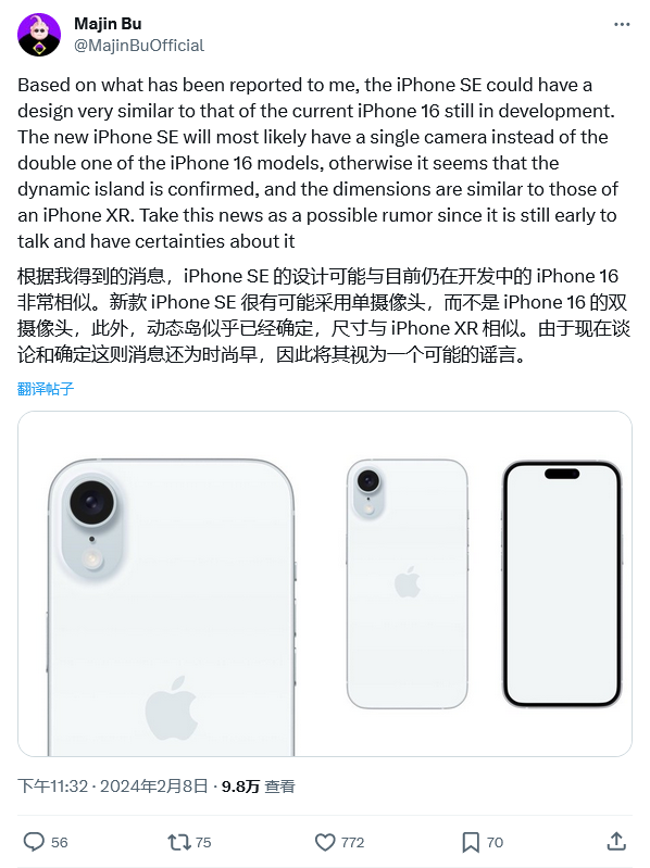 Igeekphone news on February 9, news source @MajinBuOfficial recently tweeted that Apple is redesigning the iPhone SE 4, ditching the bangs in favor of the current iPhone’s Smart Island design.