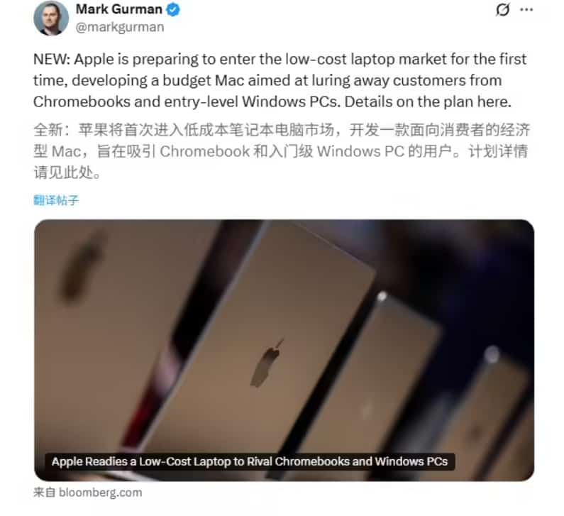 Igeekphone News, November 5th: Bloomberg reporter Mark Gurman reported today that Apple is planning to enter the low-price laptop market. This will be the first time it has launched a laptop product targeting the mass market. An Apple spokesperson declined to comment on this.