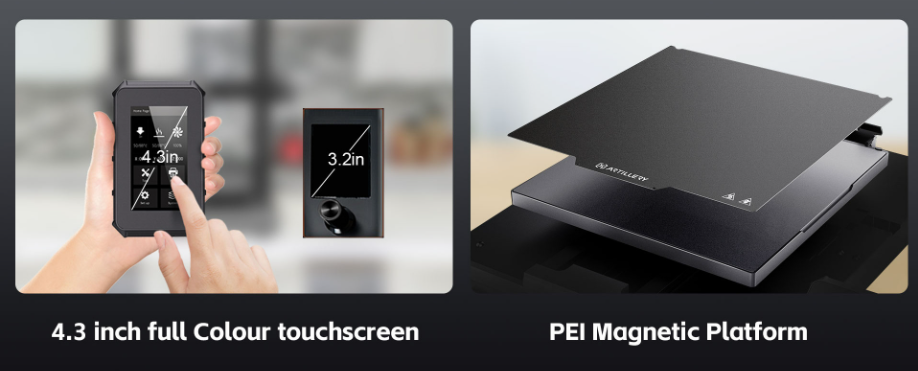 The Artillery SW X3 Pro showcases a thoughtful design that combines functionality with aesthetics. With a printing size of 240240260mm, it provides a spacious platform for bringing your creations to life. The 4.3-inch full-color touchscreen adds a modern touch to the interface, ensuring user-friendly navigation through the printer’s settings and controls. The integrated FFC cable design not only enhances the overall aesthetics but also contributes to the printer’s cable management, keeping the workspace organized and tidy.