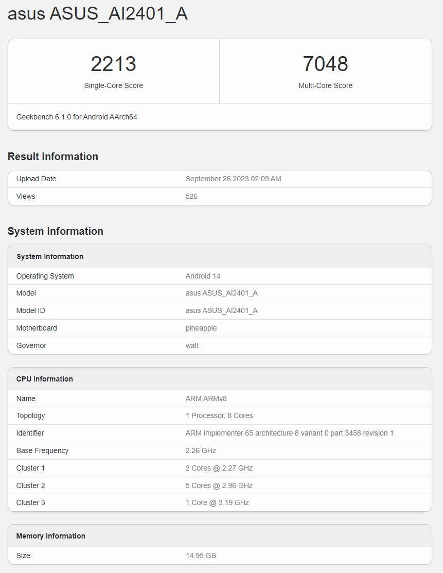 The machine has appeared in the GeekBench running library in September this year, in the version 6.1.0 single-core score of 2213 points, multi-core score of 7048 points, equipped with 16GB memory, running Android 14 system.