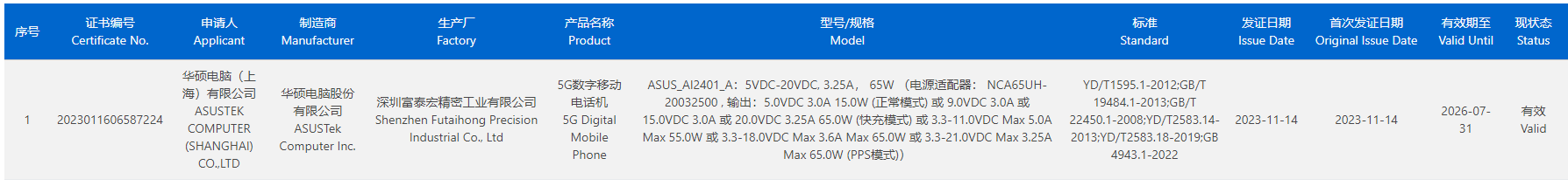 Igeekphone on November 15th news, Asus ROG mobile phone game mobile phone recently announced that with Qualcomm, ROG mobile phone 8 will be equipped with Snapdragon 8 Gen 3 Android flagship processor. The machine passed the domestic 3C certification yesterday, showing the maximum support for 65W fast charge.