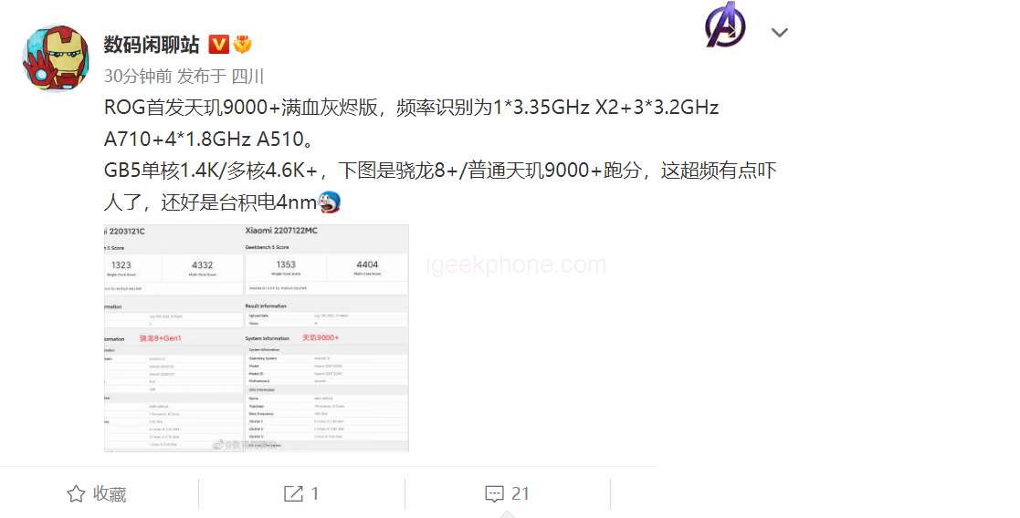 According to leakster @Digital Chat Station, the new ROG Phone 6D will launch the Dimensity 9000 + version, the frequency identification is 1*3.35GHz X2+3*3.2GHz A710+4*1.8GHz A510, GeekBench 5 single-core The score is 1.4K, and the multi-core score is 4.6K+.