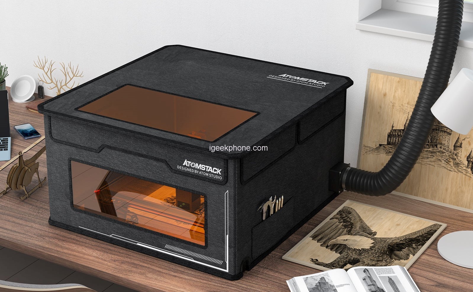 The Atomstack FB2 Enclosure Foldable Dust-Proof Cover offers a reliable protective solution for semiconductor laser engravers. This enclosure is designed with a multi-layer material construction to ensure durability and safety. It consists of three layers, including 900D Oxford cloth, honeycomb; and flame-retardant cloth with a silicone coating, making it lightweight, high-density, and fireproof. The enclosure also features an extended smoke pipe that can be conveniently adjusted from 50cm to 2m in length; allowing for efficient smoke exhaust. With a spacious area of 700x700x460mm (27.5×27.5×18.1in); the FB2 protective box offers ample room and is compatible with the majority of semiconductor laser engravers available in the market.