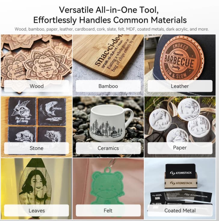 The ATOMSTACK SWIFT 3W Mini Diode Laser Engraver can engrave a wide range of materials, including wood, leather, acrylic, cardboard, and more. This versatility makes it an ideal choice for various applications, from creating personalized gifts and custom artwork to DIY projects and prototypes. With this laser engraver, you can experiment with different materials and achieve professional-grade results.