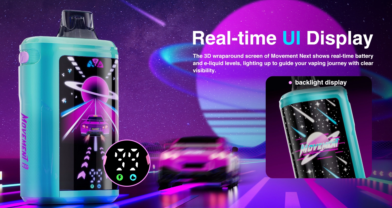 One of the most striking features of the Movement Next 30K is its sleek and modern design, highlighted by the world’s first 3D wraparound display. This revolutionary feature adds a futuristic aesthetic and provides practical real-time updates on battery life and e-liquid levels, keeping users well-informed about their vape’s status. The device’s ergonomic shape ensures a comfortable grip, making it easy to use throughout the day. Its compact design makes it portable without sacrificing functionality, offering style and substance in a single package.