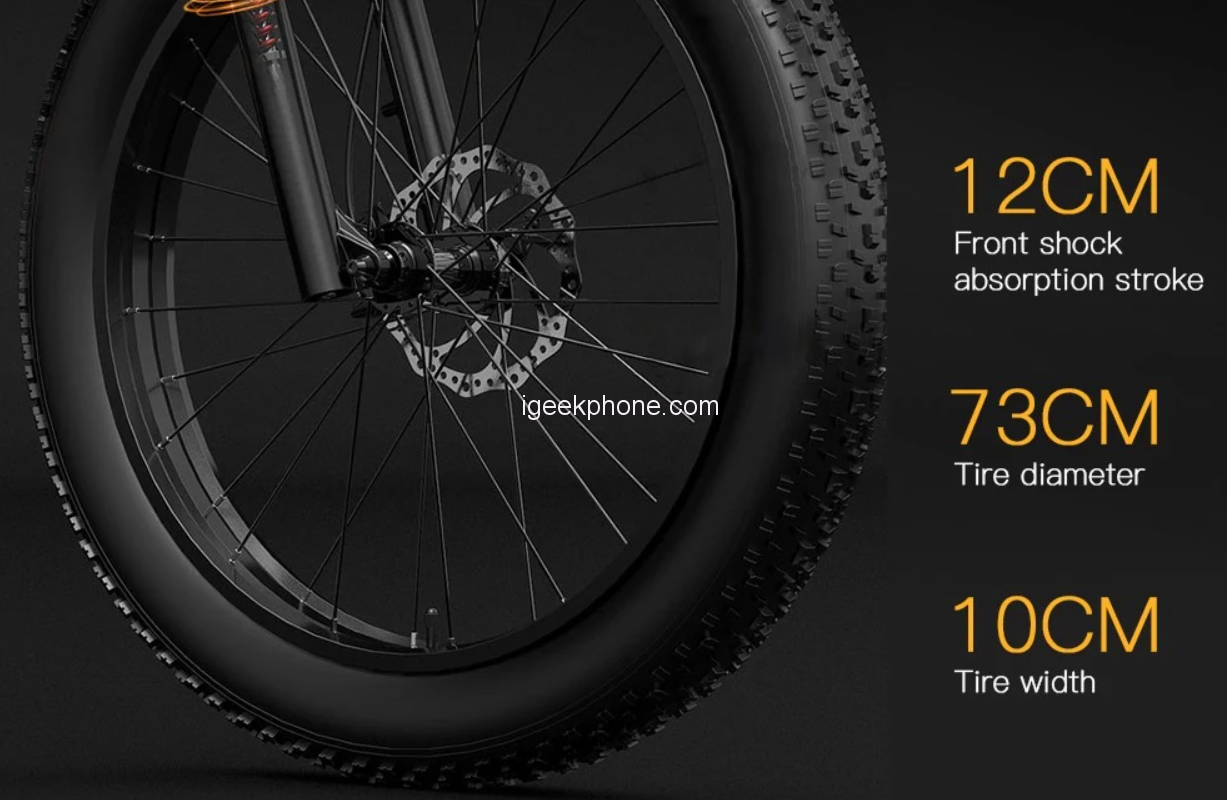 Keeping track of your ride data is a breeze with the large LCD meter. It displays essential information such as speed, mileage, speed mode, and battery life; ensuring you stay informed and in control throughout your journey. Whether you’re cruising on smooth city roads or taking on challenging off-road trails; the BEZIOR X Plus is up to the task. A 27-speed transmission system allows you to conquer a variety of terrains with ease. The 26×4.0″ fat rubber tires provide enhanced traction and a smoother ride, even on rough surfaces. The inclusion of an oil spring suspension fork adds to the overall comfort and control of this electric bike. It absorbs shocks and ensures that your ride remains smooth, even when the terrain gets bumpy.