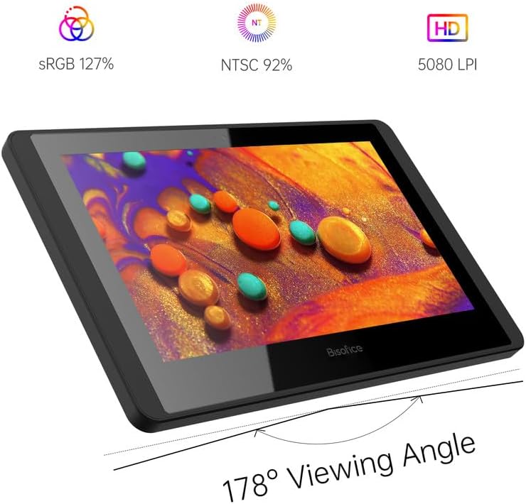 Bisofice 12HD-A Drawing Tablet with Screen comes with 11.6inch IPS HD Screen and Distinctive Color 258 x 145mm(10×5.7in) dynamic region, 1366*768 goal, 16.7M plentiful variety profundity, 1000:1 difference proportion, 250cd/㎡ splendor and 178° review point, which can convey huge, clear and bountiful showcase impact before you.