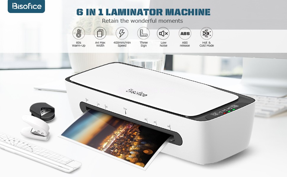 The BISOFICE Laminator Machine Set features 6 functions that cater to all your laminating requirements; including hot laminating, cold laminating, paper cutting; corner rounding, hole punching, and Hoop Binding. With a large entry width of 230 mm/9 inches; it is compatible with standard A4, A5, and A6 size paper, making it an ideal choice for both personal and professional use. This laminator set is designed to provide you with all the convenience you need in a single machine; so you can easily and efficiently complete all your laminating projects.