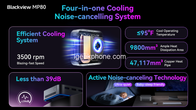 – Cooling System,  3500 rpm,  ≤95°F Cool Operating Temperature,  Active Noise-canceling Technology,  Less than 39dB