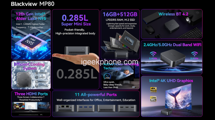 Powered by the 12th Gen Intel® Alder Lake N95 & Efficient Cooling System and equipped with 16GB LPDDR5 RAM & 512GB M.2 SSD, Blackview MP80 is crafted for fun, work, and study.