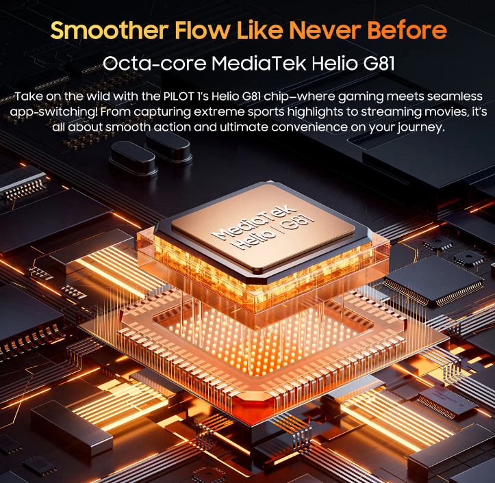 - High-Performance Processor: Powered by the MediaTek Helio G81 processor, the PILOT 1 ensures smooth performance across applications and multitasking. With options for 18GB of RAM and 256GB of internal storage, you’ll have ample space for apps, photos, and files, all while enjoying responsive performance.