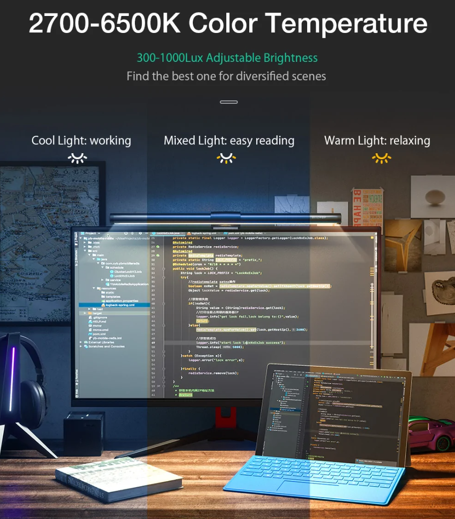The light bar boasts an adjustable brightness range of 300-1000lux, ensuring that you can fine-tune it according to your preference. This not only reduces screen reflection but also alleviates eye fatigue, providing a glare-free, bright, and soft light for clear and comfortable viewing.