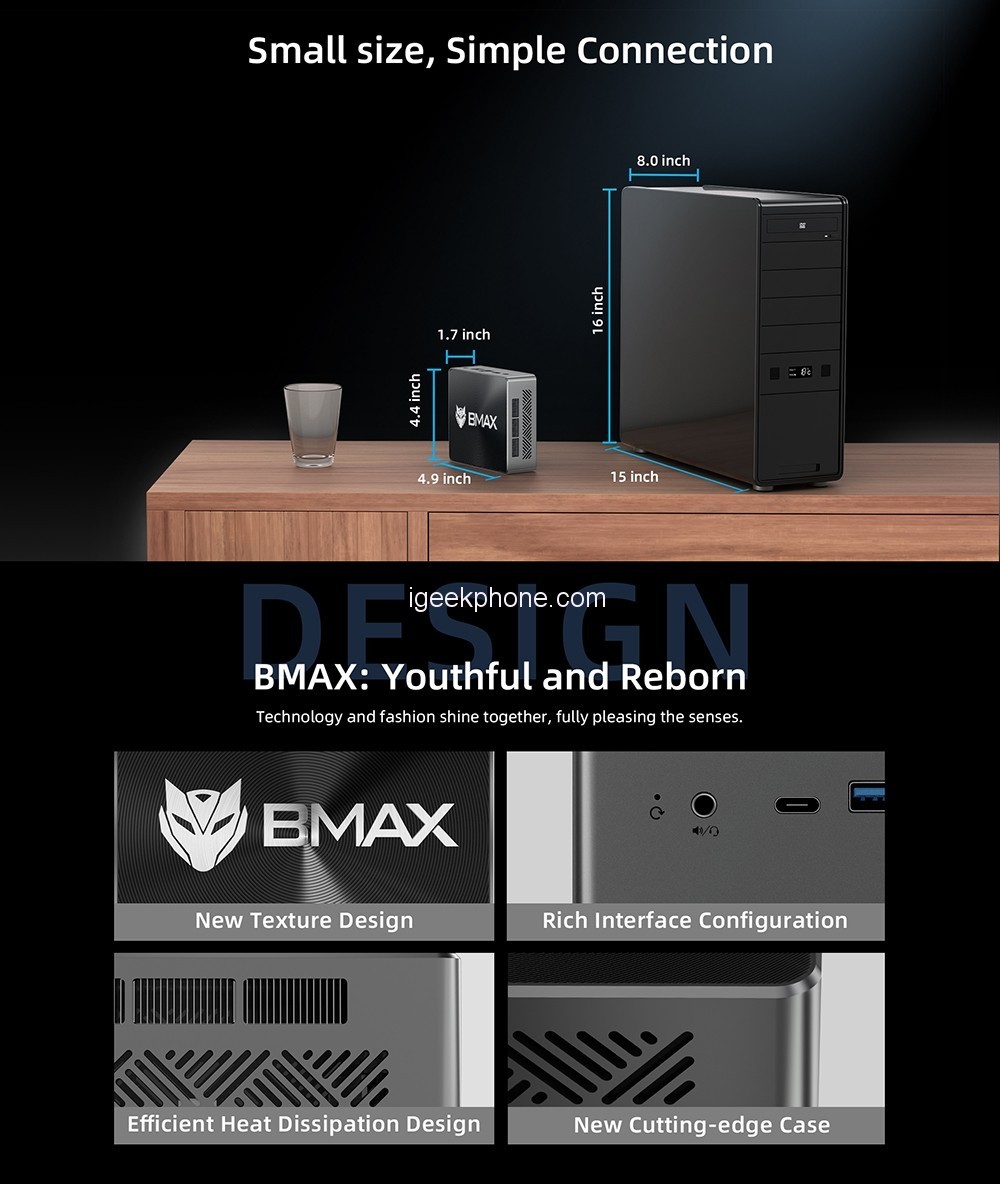 Design-wise, the BMAX B7 Pro Mini PC is sleek and compact, measuring 125 x 112 x 44mm and weighing just 370g. Its small size makes it an excellent option for those with limited desk space or who want a portable computer that can easily be carried around. The mini PC has a black metal finish that gives it a professional and modern look.