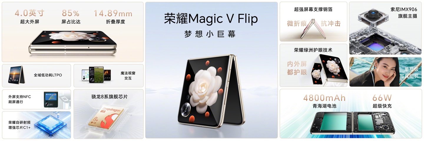 According to Igeekphone last night reported that the Honor Magic V Flip “Dream small giant screen” has been officially released, which is equipped with the first generation of Qualcomm Snapdragon 8 + processor (3.0GHz), providing 4 versions, will be officially launched at 10:08 on June 21.