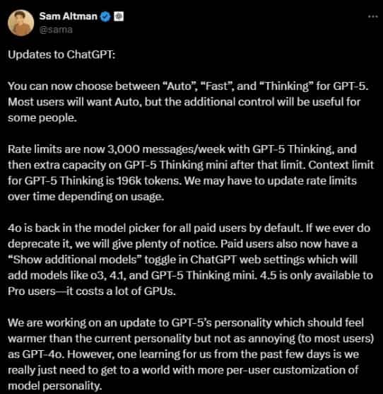 ChatGPT 5 Update: Three modes to Choose from, 4o returns