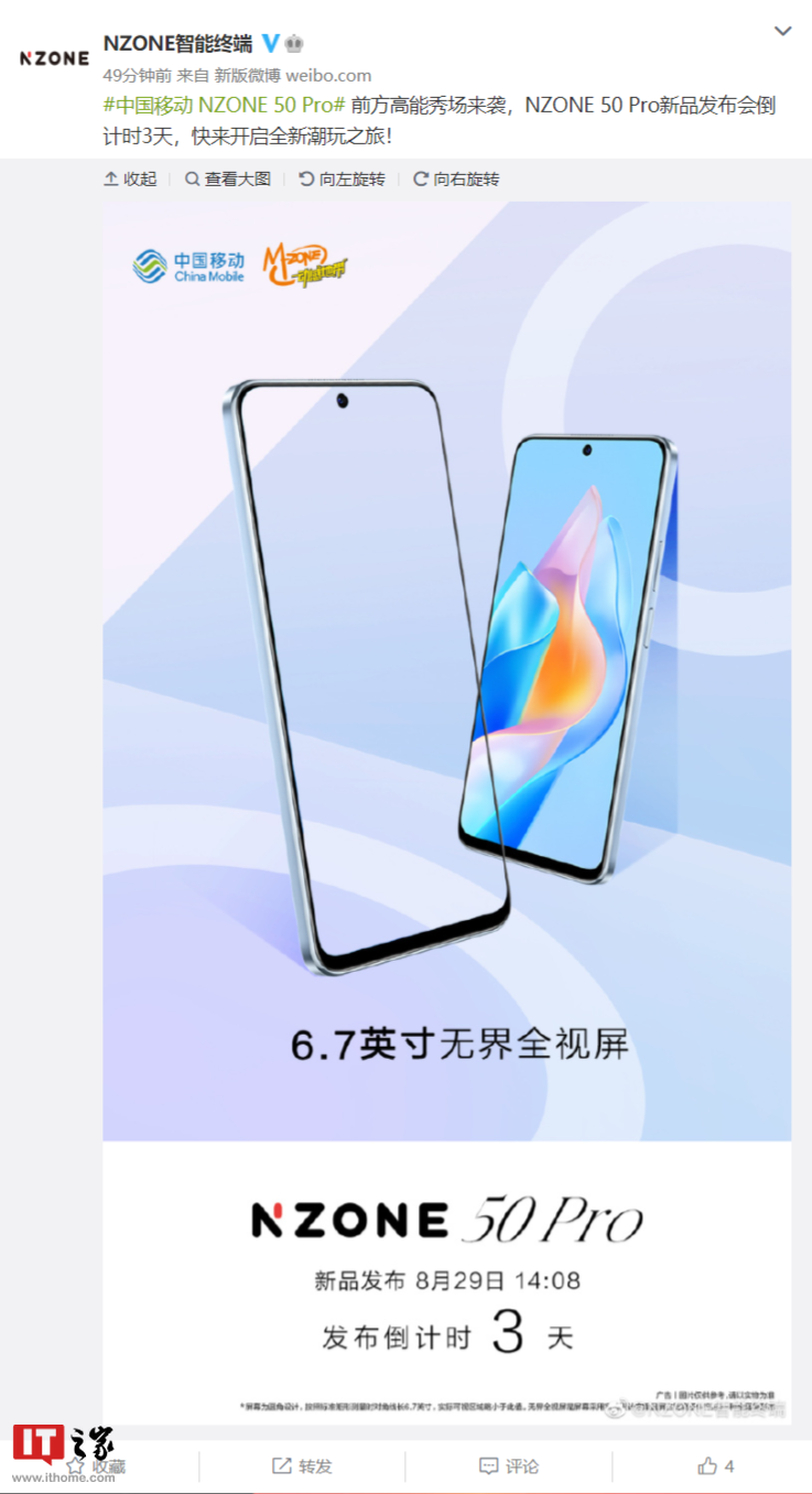 Today, China Mobile’s NZONE smart terminal announced that the new NZONE 50 Pro conference will be released at 14:08 PM on August 29th. The mobile phone will have a 6.7-inch center perforated unbounded full view screen.