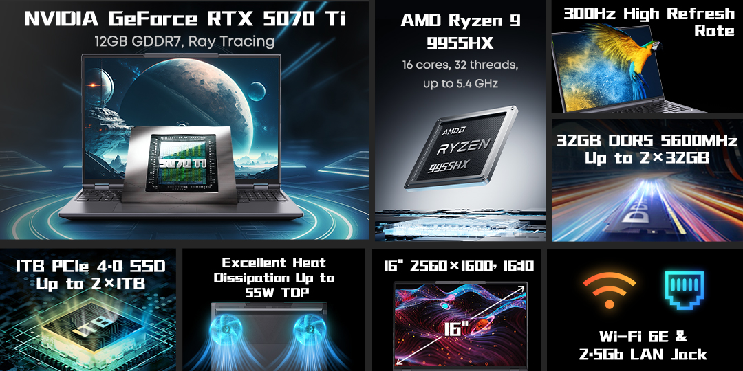 At its core, the GameBook houses an AMD Ryzen 9 9955HX CPU—Zen 5 architecture, 16 cores/32 threads, 5.4 GHz boost clock, and a 55 W TDP—paired with an NVIDIA GeForce RTX 5070 Ti Laptop GPU featuring 12 GB of GDDR7 VRAM and a 140 W total graphics power. Together, they deliver blistering frame rates in the latest AAA titles and handle complex AI workloads with ease. Memory is provisioned by 32 GB of DDR5-5600 MHz (expandable to 64 GB), while storage comes via a 1 TB PCIe 4.0 NVMe SSD, with a second M.2 slot (PCIe 5.0–ready) for future upgrades.