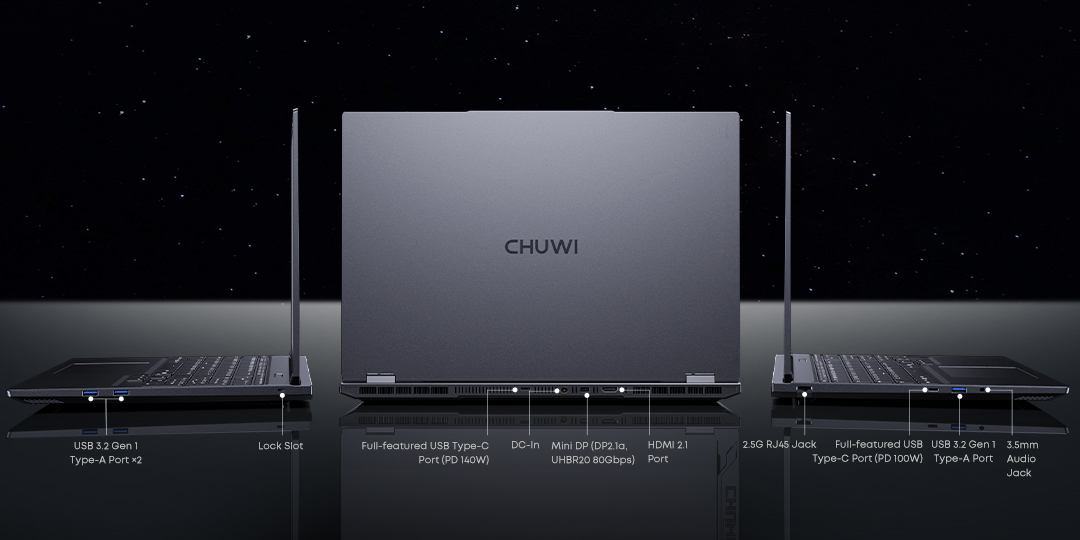 Aesthetically, the GameBook balances aggressive gaming cues with professional restraint. Its CNC-machined aluminum body features subtle chamfered edges and a matte gunmetal finish that resists fingerprints. The lid houses a minimalist CHUWI logo backlit in customizable RGB, while the hinge mechanism offers a smooth, single-handed open and close action. At under 23 mm thick and weighing just 2.1 kg, the GameBook is built for both desktop basing and on-the-go power sessions.