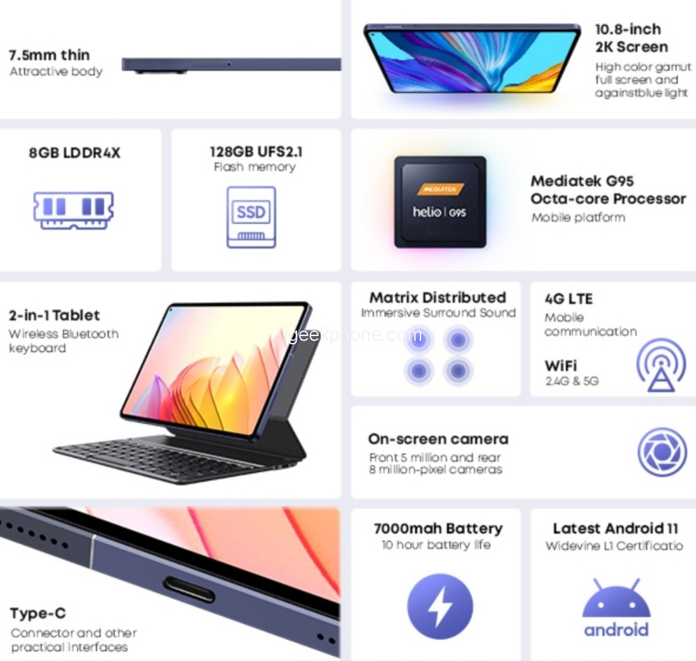 On the display aspect, the HiPad Pro features a large 10.8- inch IPS screen with 2.5k resolutions ( 2560 x 1600 ), and 16:10 wide field of view ratio. In addition, I has up to 90% ultra-high screen-to-body ratio. Images and videos are displayed in super bright and clean quality, making the HiPad Pro a perfect tablet for learning, content creation, business, games, entertainment, etc.