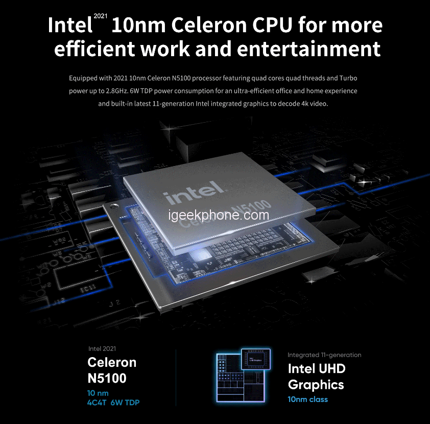 As for the hardware, Chuwi LarkBook X integrates the new Intel Celeron N5100 (10nm) CPU codenamed Jasper Lake which, with a power consumption of only 6W TDP, does not need a cooling fan. Accompanying the processor are 8GB RAM, 256GB SSD with dual-channel support for expansion, and 11th generation Intel UHD graphics for 4K video playback.