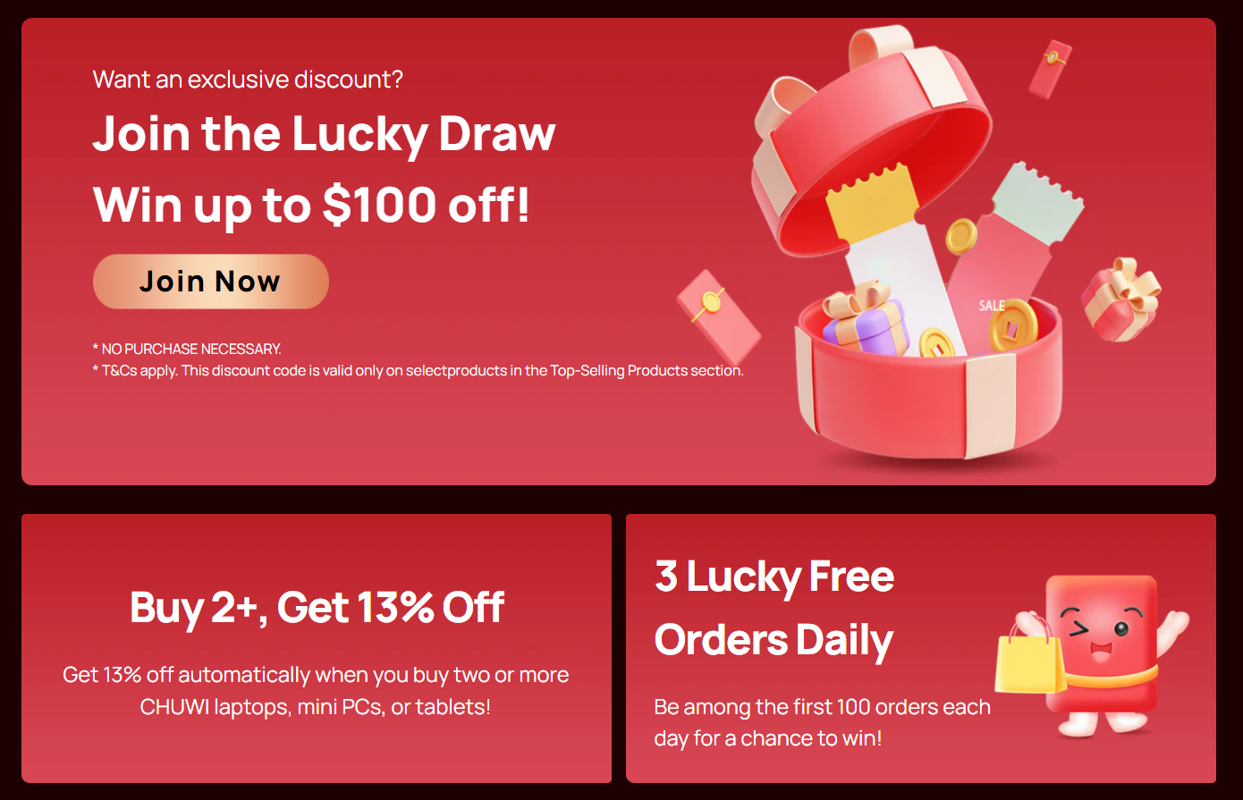 The first 100 daily buyers are entered into a random draw to have their entire order cost waived—three lucky winners each day. This surprise perk underscores Chuwi’s playful approach to promotions and can transform a modest purchase into a zero‑cost treat.