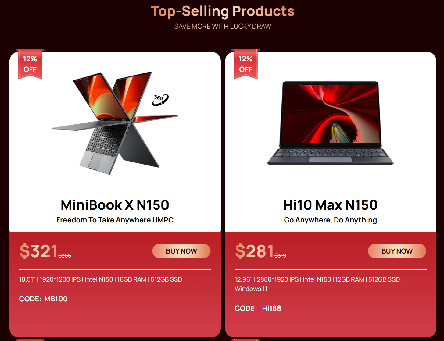 Chuwi MiniBook X N150 ($321 → $365; code MB100): A 10.51″ UMPC with Intel N150, 16 GB RAM, and 512 GB SSD—ideal for on‑the‑go productivity.