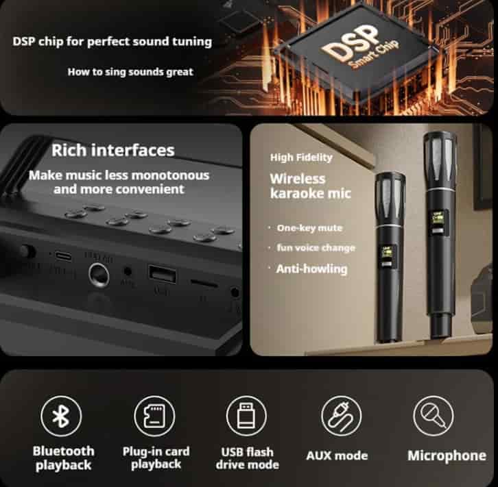 The Claison T9 Plus is more than just a speaker—it’s a portable karaoke system and party companion. With its dual microphones, HiFi sound quality, and RGB lighting, it’s designed to bring people together for a fun-filled karaoke session or party. The ability to sync the lights to the beat of the music creates an engaging visual experience, while the high-quality audio ensures that everyone can enjoy the performance.
