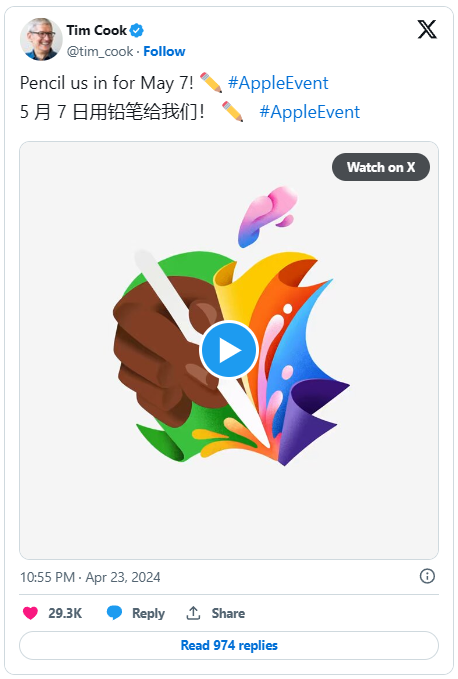 Apple has announced that it will hold a special event at 10 p.m. on May 7, and although Apple usually does not disclose the theme of the event in advance, the illustration of the invitation suggests that the event will be closely related to the iPad – the illustration includes an Apple Pencil. Not only that, Apple CEO Tim Cook also hinted on social media that the conference will launch a new Apple Pencil 3.