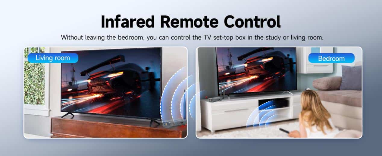 A unique feature that sets this wireless HDMI system apart. Use the included IR cables to connect the transmitter and receiver to your source device (like a cable box). This allows you to control that device from another room with its original remote. Finally, true multi-room streaming without losing control.