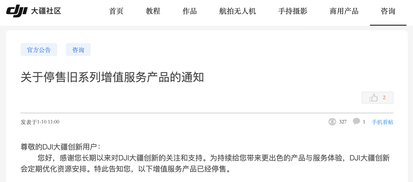 Igeekphone on January 15 news, according to the official press release of the DJI community, DJI has recently issued a Notice on the suspension of sales of old series of value-added service products, announcing that some old drones, action cameras, stabilizers and other equipment have stopped selling “DJI Care for free” and “DJI Care for free renewal” services.
