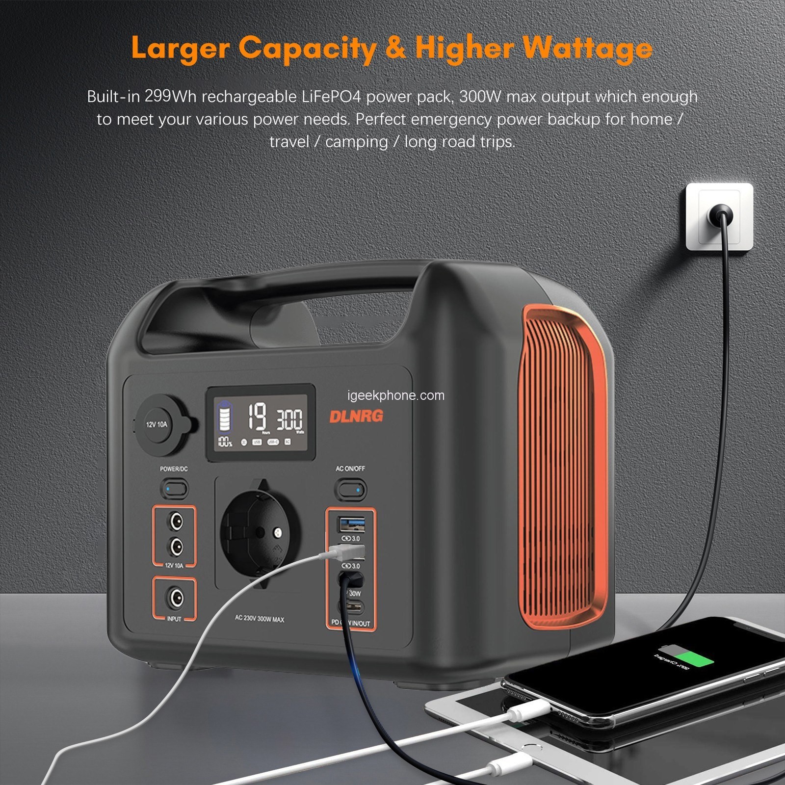 The DLNRG PD320 Portable Power Station boasts an array of features that make it stand out in the portable power station market, equipped with a 320Wh rechargeable LiFePO4 power pack and a maximum output of 300W, this power station packs a punch. It’s more than capable of meeting your various power needs, from charging smartphones and laptops to running small appliances during emergencies. The built-in LCD screen provides real-time information about the power supply and the on/off status of ports. It’s a handy feature for keeping track of your power consumption. Additionally, the high-brightness LED light, complete with an SOS flash function; comes in handy for emergency situations, making it a versatile tool for outdoor enthusiasts.