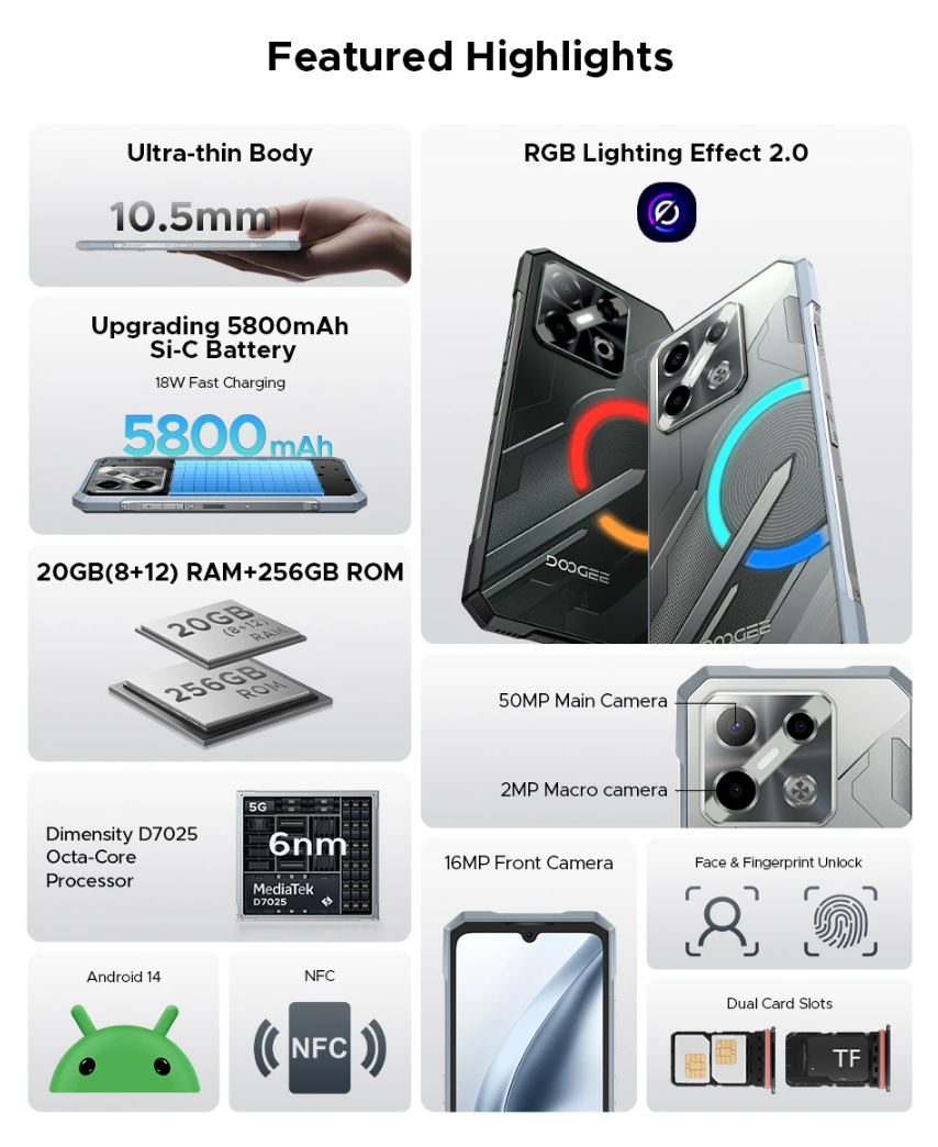 The DOOGEE Blade GT Play 5G redefines what a sub-£200 smartphone can offer. With its combination of a powerful Dimensity 7025 chipset, 120Hz display, 50MP AI camera, massive 5800mAh battery, and rugged design, it’s built for users who want both performance and durability.